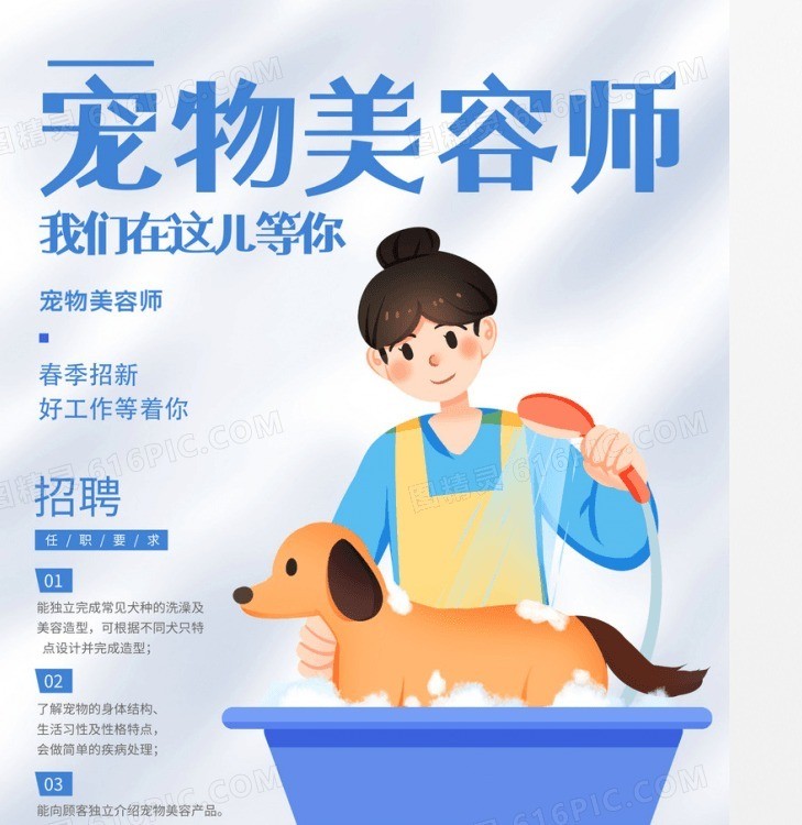 工作要求:女性,有合法工作身份宠物洗护工作,烘干、美容、驱虫等工作学习商品知识,养宠知识,配合店长工